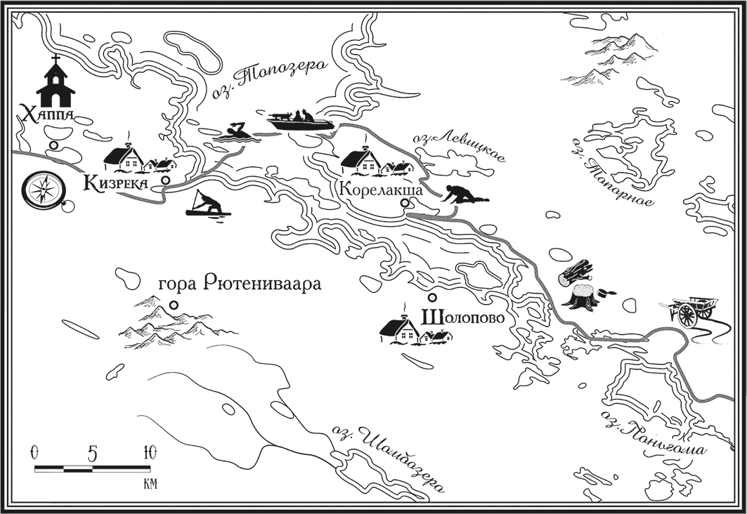 Утром третьего дня я не выдержал. Забрался на скалу повыше, прилег в ложбинку на вершине, что покрыта лишь серо-зеленым узором чахлого карельского мха, да прикинул дорогу напрямую туда, где в нескольких километрах западнее маячили набившие оскомину озера. Хорошо хоть относительно небольшие и без явных признаков жилья по берегам.