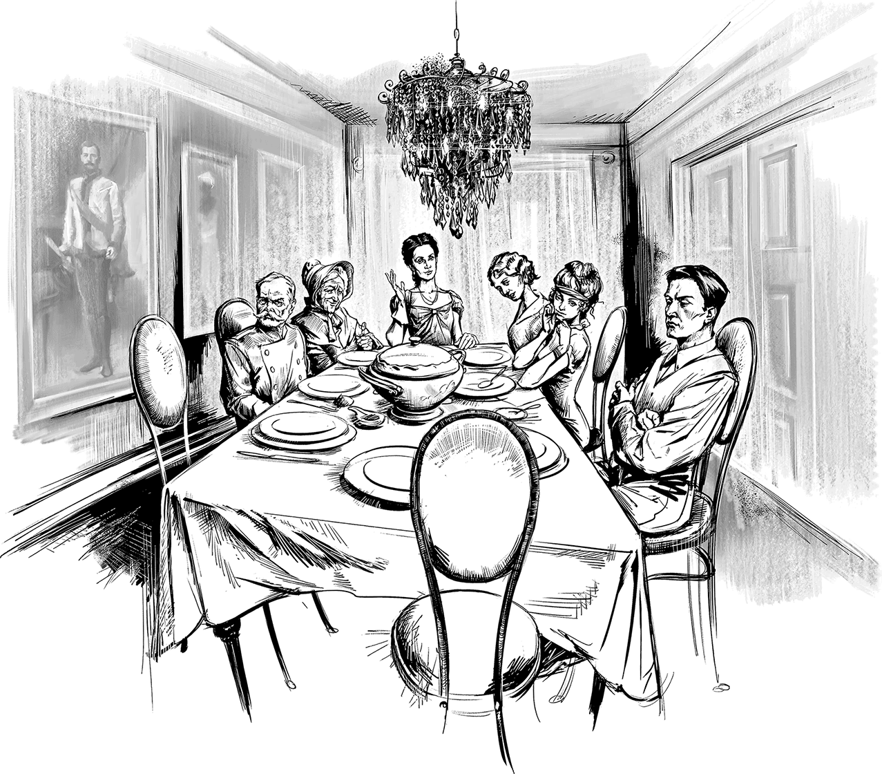 Люстра, полная вычурных хрустальных висюлек и позолоты, спускалась к столу с четырехметровой высоты, довершая тем самым картину смешения эпох и стилей.