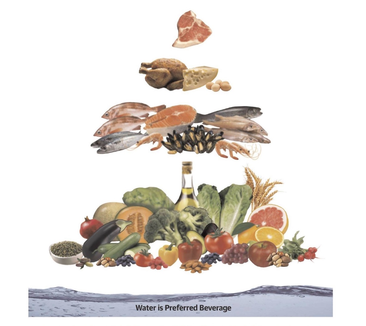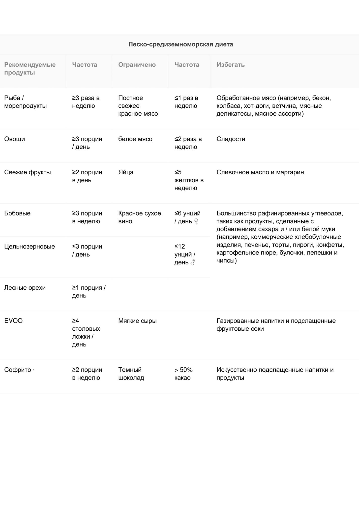 Ниже указана «пирамида» песко-средиземноморской диеты и таблица с основными рекомендуемыми продуктами, частотой их употребления и продуктами, которые нужно стремиться избегать.
