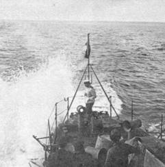 3 октября 1915 г. в 9 ч эскадренные миноносцы ’’Мощный” и ’’Искусный” снялись с якоря на рейде Лапвик, имея назначение отправиться к острову Люм. Головным шел миноносец ’Мощный”, а ему в кильватер на расстоянии 0,5 кабельтовых следовал ’Искусный”. Миноносцы благополучно обогнули веху № 1 и легли на створ недействовавших мигалок Рен нонбуксен; не доходя острова Кепмангшер, они начали склоняться вправо к нордовой вехе № 3 у острова Рухольм.
