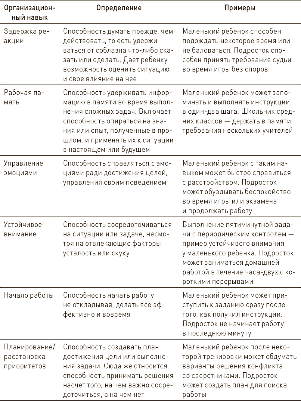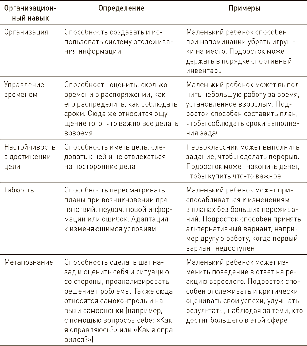 В главе 2 этот вопрос рассматривается более подробно, перечислены общие развивающие задачи, которые позволят тренировать организационные навыки на различных этапах взросления. Несложные тесты помогут понять общую картину сильных и слабых сторон ребенка и определить, когда стоит вмешаться и как-то помочь.