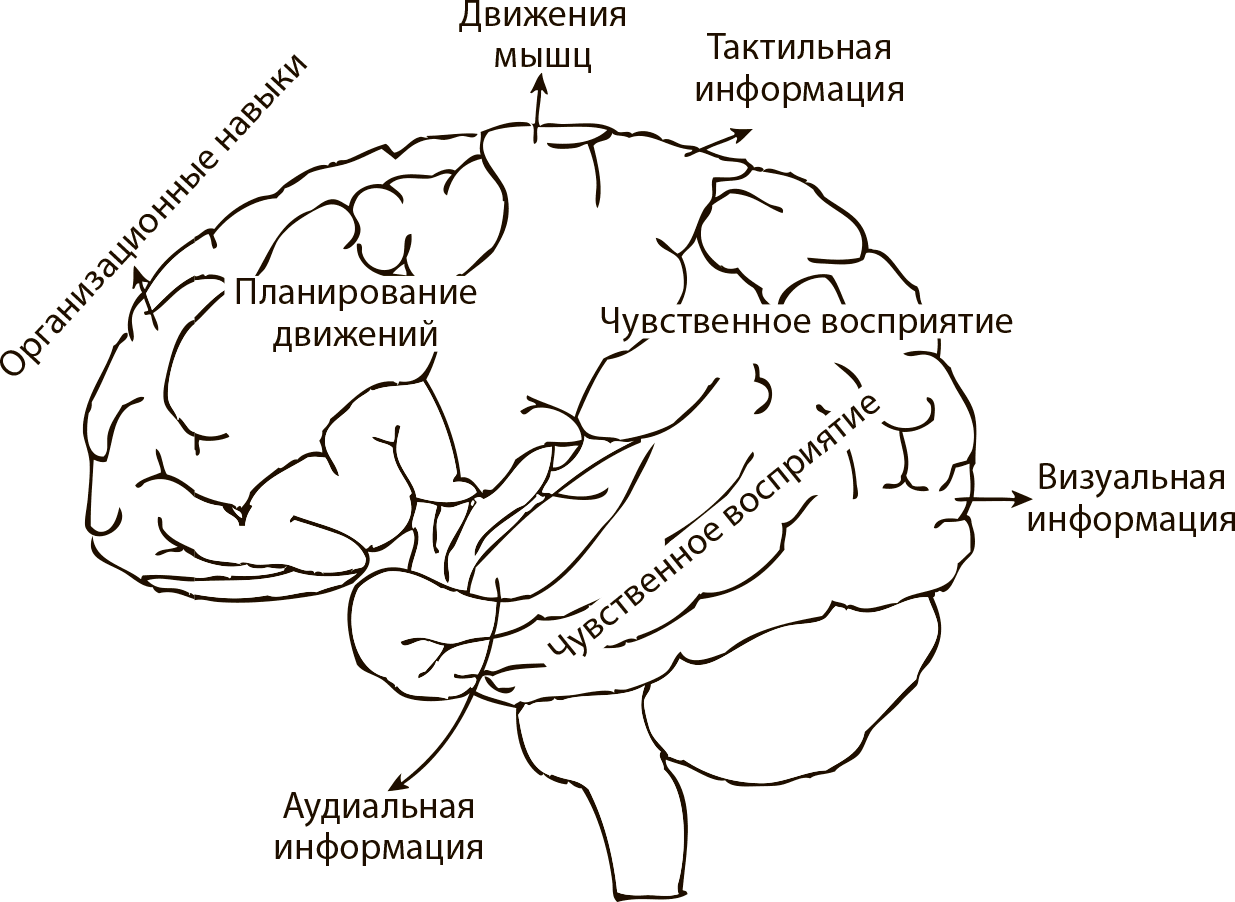 С точки зрения развития организационных навыков здесь важно следующее: исследования показывают, что скачок роста серого вещества перед подростковым возрастом происходит прежде всего в лобных долях. В целом ученые сходятся во мнении, что именно эти доли мозга играют ключевую роль в развитии организационных навыков. Поэтому мы уверенно можем говорить, что эти области, включая лобную и предлобную кору, а также связи с близлежащими областями, становятся основой для формирования организационных навыков. В предподростковый период мозг будто готовится к развитию организационных навыков и непростым задачам, для решения которых они будут использоваться в подростковом возрасте. На рис. 1.1 изображен человеческий мозг с примерным расположением основных функций, в том числе организационных навыков в предлобной коре.