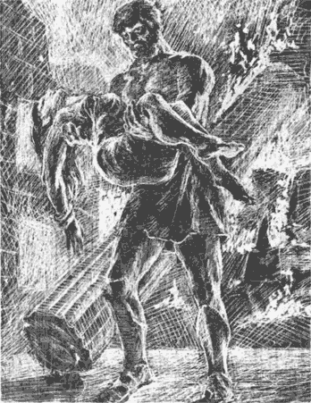 Несчастного отца умершего Требия, глядевшего неподвижным взором на обуглившиеся кости его дитяти, они старались успокоить словами сочувствия и, одарив его деньгами, отправились в обратный путь, когда стало уже довольно темно и в домах показались огни, а из труб шел дым, указывавший время ужина.