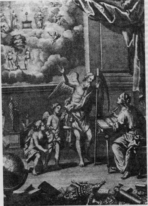 [Закрыть] Писатель (видимо, женщина) сидит за письменным столом в античной одежде. Она занимается «сравнением нескольких древних памятников, пирамид, обелисков, пантеев (статуй, сочетающих атрибуты нескольких богов), медальонов, древних авторов с несколькими описаниями, картами, путешествиями и другими достопримечательностями Америки, среди которых она восседает» (в частности, на земле можно заметить, среди прочего, Артемиду Эфесскую, лежащую как поверженный идол). Два гения помогают ей в этом. Один из них держит в левой руке кадуцей Гермеса, а в правой – красную индейскую дудку. Другой держит ирокезскую «черепаху» и ромб или систр, украшавшие статуэтки эллинистического Востока. Выше, над Адамом и Евой, воскресший Христос и Дева Мария после Успения, окруженные ангелами[552]552
