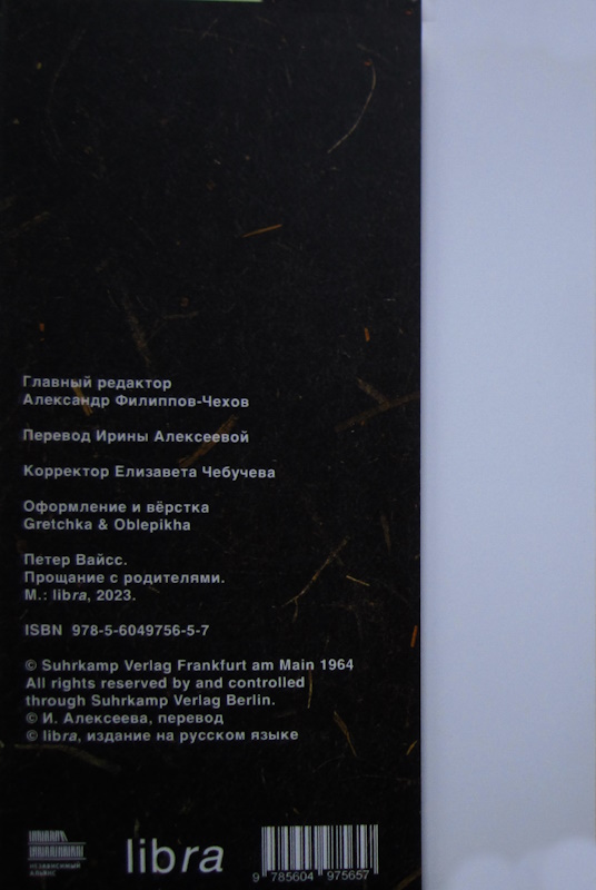 Петер Вайсс (Peter Weiss, 1916–1982) – немецко-шведский писатель, драматург, художник, кинорежиссер. Вайсс – выходец из швейцарско-венгерской семьи. Мать писателя, Фрида Хуммель, блистала в спектаклях Макса Райнхардта, а отец, Йено Вайсс, служил на фронте в качестве старшего лейтенанта императорской и королевской армии. После 1918 г. семья переселилась в Бремен, где была основана текстильная фабрика Hoppe, Weiss & Co. Несмотря на увлечение литературой Вайсс пошел по стопам отца. В 1935 г. семья перебирается в Лондон. Вайсс младший увлекается фотографией и создает первые живописные работы. В 1936 г. – следующий этап эмиграции – Чехословакия. По совету Херманна Хессе Вайсс поступает в Академию художеств в Праге, но в 1938 г. семья вынуждена отправиться в Швецию, где Йено Васс становится руководителем текстильной фабрики, а юный Петер зарабатывает на жизнь, рисуя шаблоны для тканей. Самыми известными произведениями Вайсса стали драмы «Преследование» и убийство Жана Поля Марата, представленные театральной труппой госпиталя в Шарантоне под руководством господина де Сада», «Дознание» и «Хёльдерлин», инсценировка романа Франца Кафки «Процесс», роман «Эстетика сопротивления», «микро-роман» «Тень тела кучера», едва ли не единственное произведение немецкого структурализма. Автобиографическая повесть «Прощание с родителями» была написана и опубликована в 1961 г.