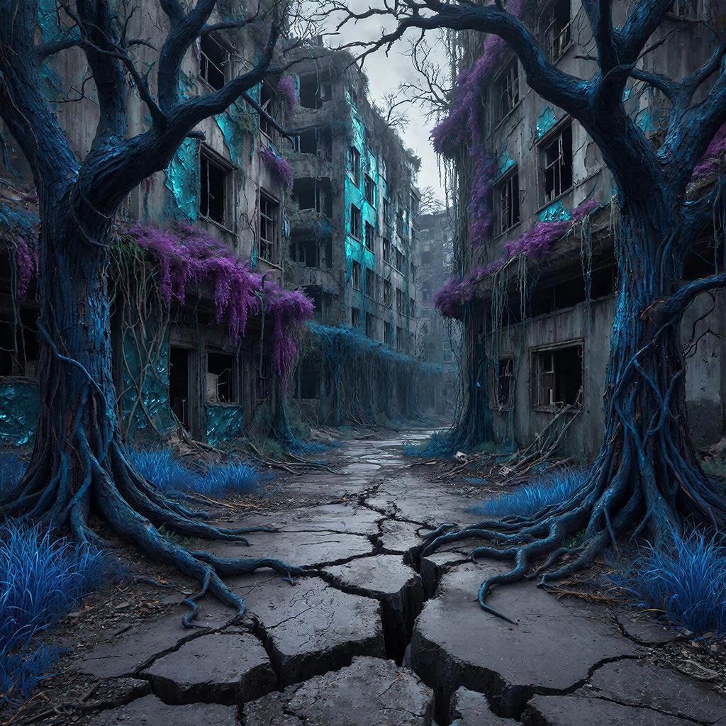 Город впереди напоминал существо, побеждённое и поглощённое природой. Бетонные громады зданий стояли опутанные лианами с фиолетовыми цветами и теми самыми «жилами» синего цвета, которые я заметил в лесу. Окна были разбиты, а кое-где с высот свисали целые занавесы странного мха, переливающегося на солнце, как мазутная плёнка.