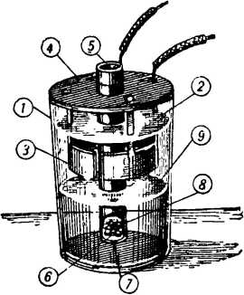 Рис. 3. Гальванический элемент и его части: 1 – стеклянный сосуд; 2 – электролит; 3 – угольный электрод; 4 – цинковый электрод; 5 – агломерат; 6 – изоляционные прокладки; 7 – крышка; 8 и 9 – провода.