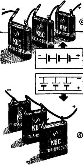 Имеются три способа соединения элементов в батареи: последовательное, параллельное (рис. 5) и смешанное.
