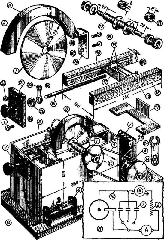 После изготовления всех частей электроискровой пилы приступайте к ее сборке. Установите на ванне электрод-диск 1 и соедините ременной передачей его шкив со шкивом электродвигателя. В качестве электродвигателя можно взять любой электродвигатель на 6—12 вольт мощностью от 3 до 10 ватт. В крайнем случае можно использовать электродвигатель от швейной машины или вентилятора.