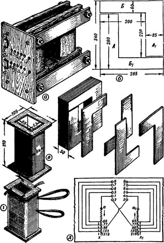 Сначала соберите магнитопровод. Возьмите пластину А (для керна) и вставьте ее в отверстие первой катушки, а к ней приложите в стык пластину Б (для ярма). Затем к пластине Б приложите пластину А, пропустив ее через отверстие во второй катушке. При этом расположите катушки так, чтобы их выводы были с одной стороны. К пластине А1 приложите в стык пластину Б1, и вы получите замкнутый магнитопровод. Следующие четыре пластины собирайте в обратном порядке, а именно: пластину А1 пропустите через отверстие во второй катушке, наложите ее сверху на пластину Б и приложите в стык с пластиной Б1. Пластину же Б1 наложите на пластину А, и т. д., пока не соберете полностью пакет магнитопровода. После сборки магнитопровода скрепите его пластины деревянными брусками, поджимая под гайки верхнего ярма скобы, как показано на рисунке 76, и.