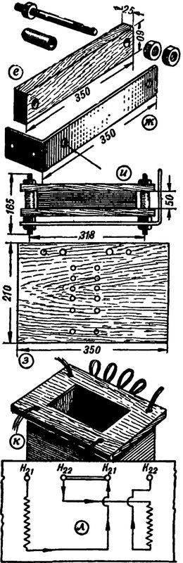 Из железной полоски сделайте скобы (рис. 76, ж) для крепления клеммной колодки. Изготовьте из сухой доски клеммную колодку (рис. 76, з) и пропитайте ее олифой. Подберите 16 одинаковых клеммных зажимов или болтов с гайками и приступайте к сборке трансформатора.