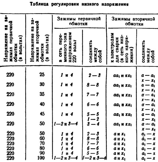 Эта таблица поможет вам правильно регулировать напряжение, снимаемое с зажимов вторичной обмотки. В первой графе этой таблицы приведено напряжение, подводимое к зажимам первичной обмотки. Во второй графе указаны напряжения, снимаемые со вторичной обмотки при соответствующих закороченных зажимах в первичной и вторичной обмотках. В третьей графе показано, какие зажимы надо присоединять к осветительной сети. В четвертой графе указано, какие зажимы первичной обмотки надо соединить накоротко. В пятой графе показано, какие зажимы надо включать в сеть низкого напряжения, а в шестой графе приведены зажимы, которые надо соединить накоротко.
