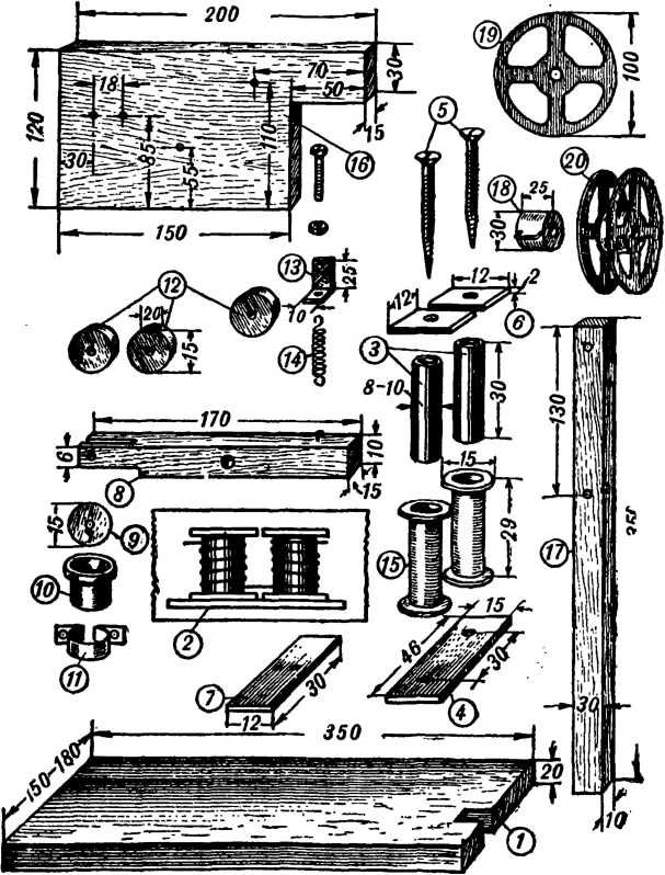 На деревянном основании укрепляют электромагнит 2. Затем закрепляют на оси коромысло 12 и подвешивают его с помощью пружины 17 к кронштейну 15. Расстояние между якорем и наконечником электромагнита подбирают путем подтягивания винта 18 пружины 17. Ориентировочно зазор между якорем и электромагнитом должен быть 3–4 миллиметра.
