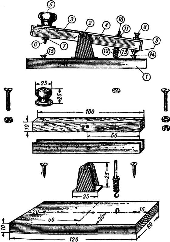 Он состоит из деревянного основания 1, стойки ключа 2, сделанной из медной пластинки толщиной 1,5–2 миллиметра, и деревянного коромысла 3, обтянутого с трех сторон жестяным кожухом 4. На одном конце коромысла ставят головку ключа 5, прикрепленную винтом 6 и гайкой 7. На противоположном конце коромысла крепят передний контактный винт 8, закрепленный гайками 9. В отверстие, расположенное на коромысле ближе к стойке, пропускают регулировочный винт 10 ключа с гайкой 11. На винт надевают пружину 12, одним концом ее прикрепляют к основанию ключа скобочкой 13.