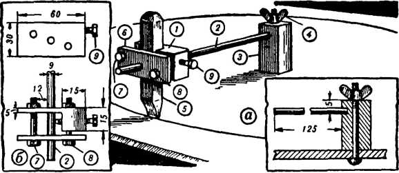 Главной частью приспособления является держатель. Он состоит из основания 1, прижимной пластинки 6, стягивающих болтов 7 и 5, стопорного болта 9 и стержня 2.