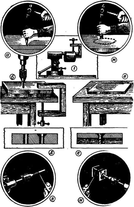 Если необходимо проделать большое отверстие в металле, проще всего просверлить по окружности намеченного отверстия ряд отверстий, одно возле другого, как показано на рисунке 89, ж. Промежутки между ними и середину надо вырубить зубилом, а края отверстия выровнять полукруглым напильником. Отверстия сверлят на окружности так, чтобы внешние края примерно совпадали с намеченной линией.