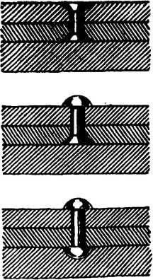 Чтобы закладная головка заклепки не смялась, ее помещают в углубление, высверленное в металлической болванке или обжимке, как показано на рисунке 91. Высверленные углубления по диаметру и профилю должны соответствовать размерам головки заклепки. В сквозное отверстие скрепляемых деталей вставляют снизу заклепку, помещая ее головку в соответствующее углубление болванки.
