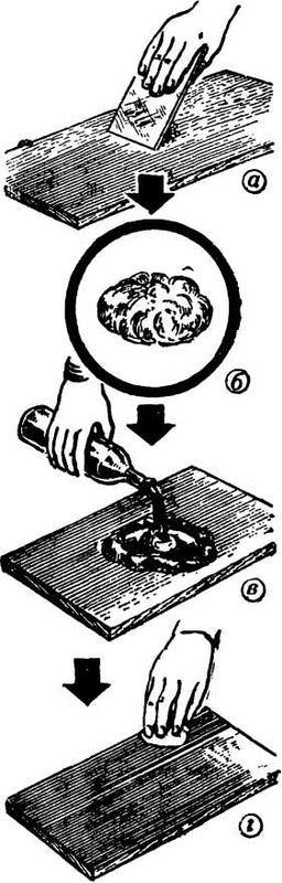 Полировку следует делать с помощью завернутого в тряпку тампона из ваты. Кусок ваты берут такой величины, чтобы при довольно сильном сжатии он имел объем с куриное яйцо (рис. 92, б). Тряпку надо взять размером около квадратного дециметра. Затем ком ваты кладут в тряпку и на него с одной стороны наливают политуру так, чтобы пропиталась его верхняя часть (рис. 92, в): ком ваты должен впитать около чайной ложки политуры. Края тряпки довольно туго стягивают, при этом в средней части тампона сквозь тряпку начнет просачиваться политура. Эта сторона тампона и будет его рабочей поверхностью.