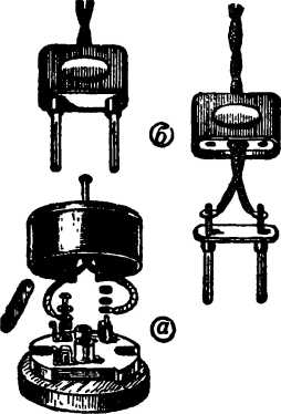 Во втором варианте патрона (рис. 27, б) контактами служат две металлические пластинки, изогнутые в виде скобочек с лапками, а конструкция других деталей такая же, как в первом варианте патрона.