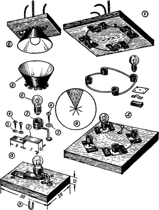 Если потребуется осветить всю комнату, то можно изготовить специальную люстру с несколькими параллельно включенными лампочками. Простейшая конструкция люстры показана на рисунке 26, г.