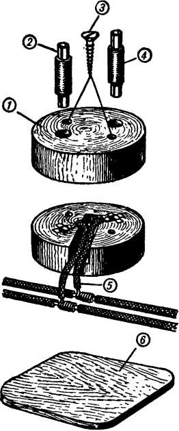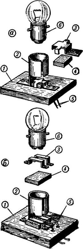 Рис. 27. Самодельные патроны для автомобильных лампочек. 1 – деревянное основание; 2 – металлический цоколь; 3 – контактные пластинки; 4 – резиновая подкладка; 5 – соединительные провода; 5 – цоколь лампочки.