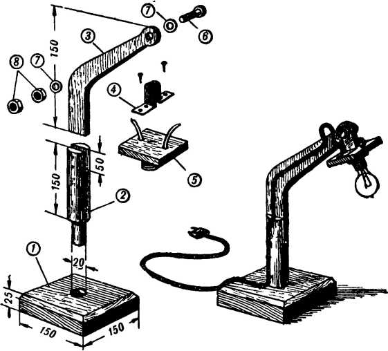 Скрепите шурупами нижний конец кронштейна с верхним концом стойки. К свободному концу кронштейна прикрепите патрон на шарнире, то есть при помощи болтика 6, шайбочек 7 и гаечек 8. Шарнирное соединение позволяет поворачивать патрон с лампочкой на нужный угол вокруг оси (болтика 6) на верхнем конце кронштейна.