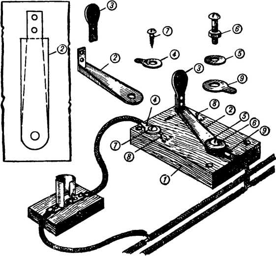 Подберите сухую дощечку, обработайте ее поверхность, сделайте из нее основание 1 и пропитайте его олифой или парафином. Изготовьте по выкройке подвижный ползунковый контакт 2 из упругой бронзовой пластинки или контактной латуни. Сделайте из пластмассовой расчески или линейки рукоятку 3 с двумя отверстиями, приклепайте ее к ползунковому контакту. Изогните конец ползунка с рукояткой под углом 90° и отогните его края в ту же сторону по пунктирным линиям. Вырежьте из металлической пластинки два одинаковых контактных лепестка 4 и шайбочку 5. Подберите болтик с гаечкой 6, небольшой шуруп 7 и два мелких гвоздика-ограничителя 8. Прикрепите к основанию ползунок и неподвижный контакт 9, как показано на рисунке. По бокам подвижного контакта вбейте два гвоздика 8. При повороте ползунка влево цепь размыкается (разрывается), что соответствует положению «выключено», а при повороте вправо до отказа цепь замыкается, что соответствует положению «включено».
