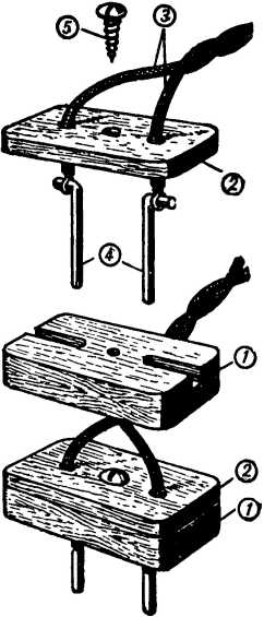 Сделайте из сухого дерева колодку 1 с двумя углублениями и отверстиями для штифтов и крышку 2 с тремя отверстиями. Два из них – крайние – для вывода проводов 3 от штифтов 4, а среднее – для стягивающего винта 5. Колодку с крышкой пропитайте олифой или парафином. Из толстой медной проволоки изогните два штифта, пропустите через отверстия концы соединительного гибкого шнура, припаяйте их к изогнутым концам штифтов и оберните изоляционной лентой.