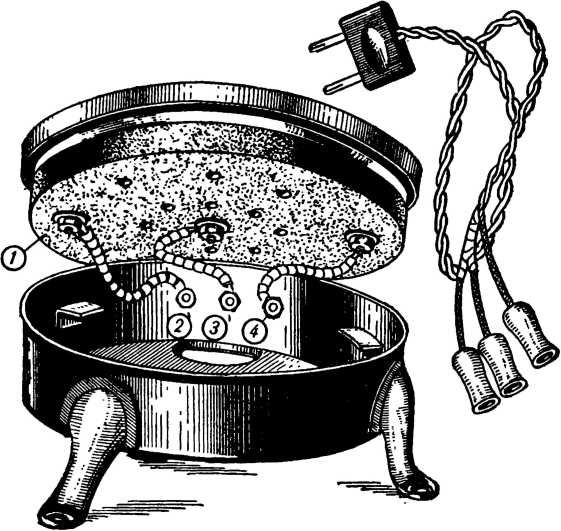 Рис. 35. Ремонт электроплитки: 1 – керамический диск; 2, 3, 4 – контакты, соединяющие спираль со шнуром.