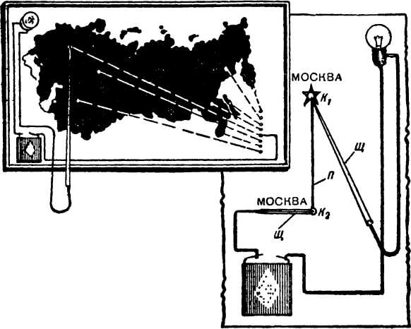 Рис. 39. Монтажная схема электрификации географической карты: К1 и К2 – контакты; Щ – щупы; П – провод.