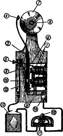 Когда ток проходит по обмотке электромагнита, сердечник 15 намагничивается и притягивает к своим полюсам якорь. Молоточек якоря ударяет по чашечке.