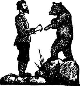 Вырежьте из картона фигурки человека, например сказочного крестьянина и медведя. Приклейте крестьянину руки, а медведю – передние лапы из папиросной бумаги так, чтобы они свободно поднимались. Приклейте каждую фигурку отдельно на куске стекла или укрепите их на пробках, воткнутых в горлышко бутылок. Наэлектризуйте одну фигурку положительным, а другую – отрицательным электричеством и постепенно сближайте их. Вы будете наблюдать, как крестьянин протянет руки к медведю (рис. 54).
