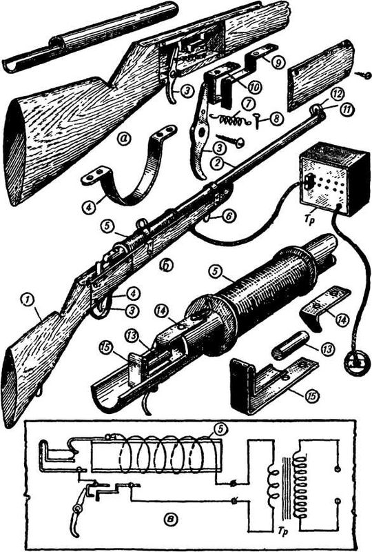 Модель электрической винтовки показана на рисунке 56, а, б. Она состоит из деревянной ложи 1, на которой закреплены ствол 2, спусковой крючок 3 с контактами, предохранительная скоба 4, катушка соленоида 5, скобы 6 для крепления ремня, пружины 7, прикрепленной к шурупу 8 и спусковому крючку.