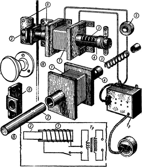 Простейший электрический замок показан на рисунке 57, а. Он состоит из катушки соленоида 1, железного сердечника 2 с пружиной 3, направляющего желоба 4, кнопки 5 и замочных скоб 6.
