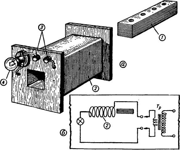 Рис. 58. Устройство прибора для регулирования яркости света (а – общий вид прибора; б – электрическая схема): 1 – сердечник; 2 – катушка; 3 – зажимы; 4 – патрон.