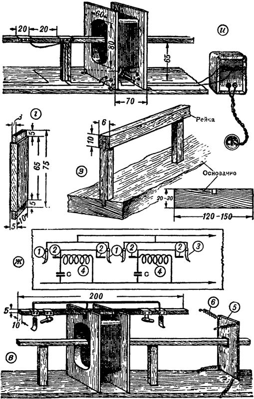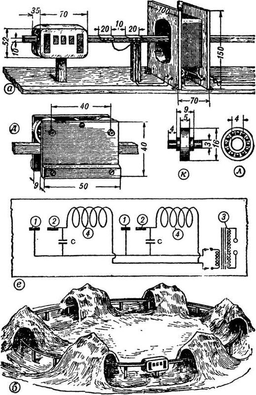 Рис 60. Соленоидная дорога и ее части: а – участок круговой соленоидной дороги с вагончиком; б – общий вид; в – конечный участок прямолинейной дороги (5—отражательная доска, 6 – пружины); г – опорный столбик; д – рама вагончика: е – электрическая схема круговой дороги (1, 2 – контакты, 3 —понижающий трансформатор, 4 – соленоидные катушки); ж – электрическая схема прямолинейной дороги (1, 3 – подвесные латунные контакты, 2 – угольные жестко укрепленные контакты, 4 – соленоидные катушки); з – крепление рейки на основании дороги; и – понижающий трансформатор; к, л – форма и размеры колес для вагончиков.