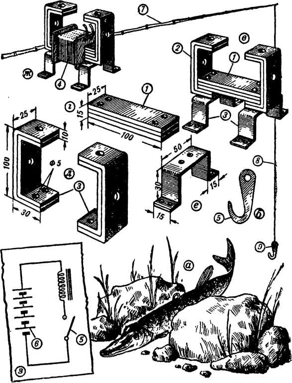 В качестве удилища возьмите круглую палочку диаметром 20–30 миллиметров и длиной около 2–3 метров. На конце удилища закрепите при помощи прочной тонкой нитки крючок, сделанный из жести (рис. 61, б). Электромагнит сделайте с составным магнитопроводом, как показано на рисунке 61, в. Сердечник изготовьте из полосок мягкой стали по форме и размерам, показанным на рисунке 61, г. Полюсные наконечники изготовьте в виде стоек с отверстиями на нижних отогнутых концах (рис. 61, д). Крепежные лапки (рис. 61, е) изготовьте из медной, латунной или алюминиевой пластинки. Склейте каркас катушки из тонкой фанеры, просушите его и покройте каким-либо изоляционным лаком. На каркас намотайте 1500 витков обмоточного провода диаметром 0,2–0,5 миллиметра. Припаяйте гибкие выводы к концам обмотки и прикрепите их к катушке нитками.