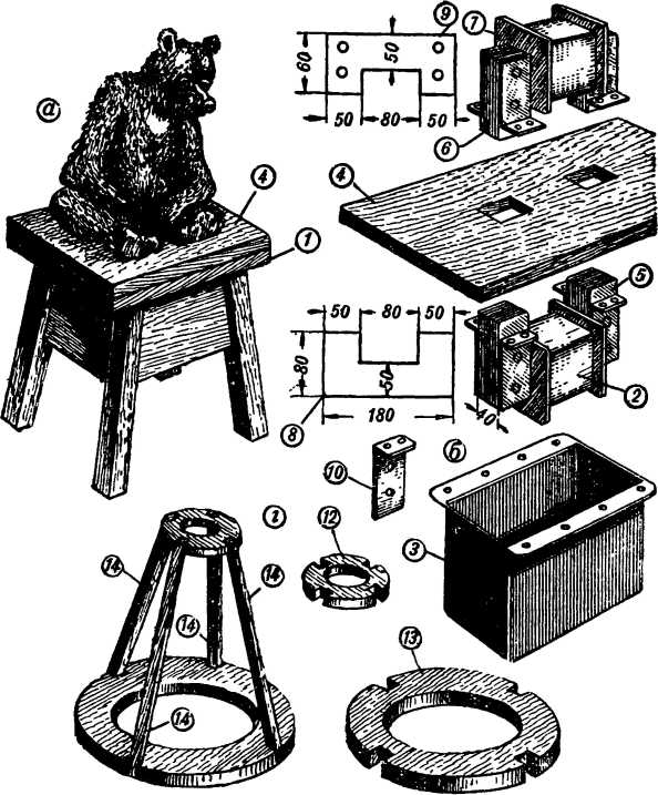 Рис. 62. Внешний вид стола и его части: 7 – электрический стол; 2 – половина трансформатора с первичной обмоткой; 3 – кожух для катушки с первичной обмоткой трансформатора; 4 – крышка стола; 5 – сердечник первичной катушки трансформатора; 6 – сердечник вторичной катушки трансформатора; 7 – каркас катушки; 8 – выкройка для пластин сердечника первичной катушки трансформатора; 9 выкройка для пластин вторичной катушки трансформатора; 10 – лапки для крепления сердечника первичной и вторичной обмоток; 11– сердечник второй половины трансформатора со вторичной обмоткой; 12 – малое кольцо каркаса мишки; 13 – большое кольцо каркаса; 14 – рейки туловища; 15 – основание мишки; 16 – электросигнал; 17 – лампочки; 18—кольцо для крепления лампочек вместо глаз; 19 – внешний вид макета мишки.