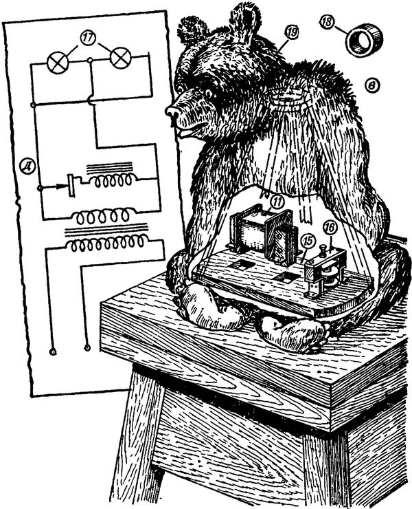 После намотки катушки припаяйте гибкие выводы и закрепите их нитками. Сделайте основание из толстой фанеры или доски с отверстиями для концов сердечника. Прикрепите сердечник к основанию так, чтобы его концы были на уровне противоположной плоскости основания. Наклейте на основание очень тонкий лист фанеры, чтобы закрыть концы сердечника. Рядом со вторичной обмоткой установите электросигнал, как показано на рисунке 62, в, и приступайте к изготовлению макета мишки.