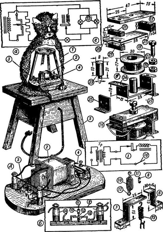 Рис. 63. Устройство аттракциона «Дикий кот»: а – общий вид конструкции (1– макет кота, 2 – вторичная обмотка трансформатора, 3 – тепловое реле, 4 – зуммер, 5 – стол); б – устройство теплового реле (6 – неподвижный контакт, 7 – подвижный контакт, 8 – крепежное кольцо, 9 – нихромовая проволока, 10 – перемычка, 11 – верхний крючок, 12 – нижний крючок, 13 – оттяжная пружина, 14 – ролики, 15 – лампочки, 16—выключатель); в – общий вид зуммера и его части (17 – крышка, 18 – контактно-регулировочный винт, 19 – контргайки, 20 – якорь электромагнита, 21 – изоляционные прокладки, 22 —катушка электромагнита, 23 – сердечник, 24 – корпус зуммера с сердечником, 25 – крепежные лапки, 26 – общий вид зуммера); г – схема включения зуммера; д – монтажная схема кота; е – электрическая схема кота.
