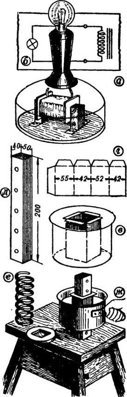 Рис. 64. Конструкция приборов: а – устройство «волшебной лампы»; б – схема включения лампы; в – конструкция кастрюли; г– выкройка внутренней стенки кастрюли; д – конструкция сердечника; е – соленоид; ж – демонстрация электроплавки (на столе, слева, лежит алюминиевое кольцо, необходимое для демонстрации действия вихревых токов).