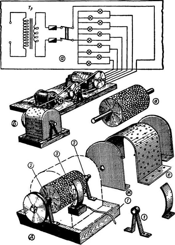 Основание прибора сделайте из досок, а стойки – из стальных полос. Из тонкой фанеры или картона согните цилиндр. Наколите шилом по всей поверхности цилиндра мелкие отверстия. Установите валик на основании в стойках. Прикрепите к основанию возле валика электрическую лампочку мощностью 70—100 ватт на высокой подставке и закройте ее защитным козырьком, как показано на рисунке 65, д. Все это накройте цилиндрическим кожухом с дырочками и закрепите его на основании. Кожух с торцов закройте картонными крышками.