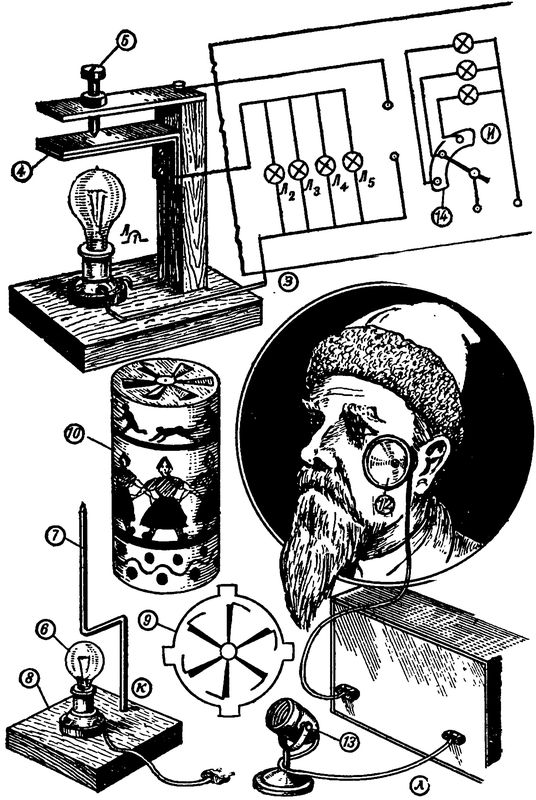 Рис. 65. Устройство приборов для электрификации новогодней елки: 1 – основание прибора искусственного снегопада; 2 – стойки прибора; 3 – лампа подсвечивания; 4 – биметаллическая пластинка; 5 – контактный винт; 6 – лампа накаливания карусели; 7 – ось карусели; 8 – основание карусели; 9 – круг для карусели; 10 – цилиндр карусели; 11 – радиоприемник; 12 – громкоговоритель; 13 – микрофон; 14 – биметаллическое реле; Тр – понижающий трансформатор; Л1 – лампа накаливания; Л2, Л3, Л4, Л5 – лампочки гирлянд.