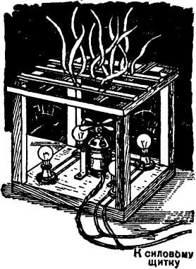 Вокруг двигателя установите четыре настенных патрона, соедините их между собой параллельно осветительным шнуром, присоедините их к проводам от электродвигателя и подключите к сети через предохранители и рубильник или выключатель. В патроны вверните лампочки мощностью по 14–40 ватт. Скрепите стойки между собой деревянными рейками. Обтяните боковые стенки ящика красной материей или полупрозрачной красной бумагой.