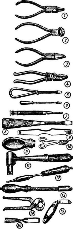 Рис. 67. Набор электромонтажных и слесарных инструментов: 1 – круглогубцы; 2 – кусачки; 3 – плоскогубцы; 4 – пассатижи; 5 – мелкомонтажная отвертка; 6 – электромонтажная отвертка; 7 – универсальная часовая отвертка; 8 – отвертка для слесарных работ; 9 – отвертка для столярных работ: 10– ножницы по металлу; 11 – молоточный электропаяльник; 12 – торцовый маломощный электропаяльник; 18—торцовый электропаяльник на 80—100 ватт; 14 – клещи; 15 – перочинный нож;16 – стамеска.