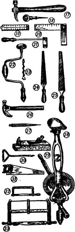 Рис. 68. Набор столярных и слесарных инструментов: 17 – молоток; 18 – шило; 19 – линейка; 20 – угольник; 21 – подогревной паяльник; 22 – коловорот; 23 – пёрка; 24 – трехгранный напильник; 25 – плоский напильник; 26 – молоток-гвоздодер; 27 – керн; 28 – дрель ручная; 29 – рубанок; 30 – буравчик; 31 – ножовка; 32 – пилка по металлу; 33 – лучковая пила.