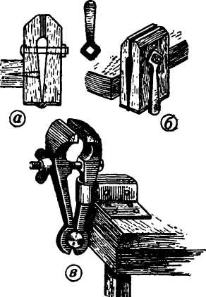 Рис. 69. Самодельные настольные тиски: а, б – деревянные тиски без разжимной пружины; в – приспособление ручных тисков в качестве настольных.