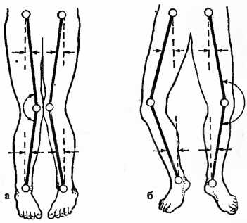 а – колени, вывернутые ковнутри (вальгусное положение); б – колени, вывернутые кнаружи (варусное положение)