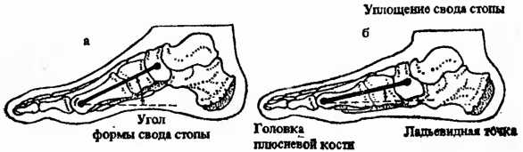 а – нормальная стопа; б – уплощение свода стопы