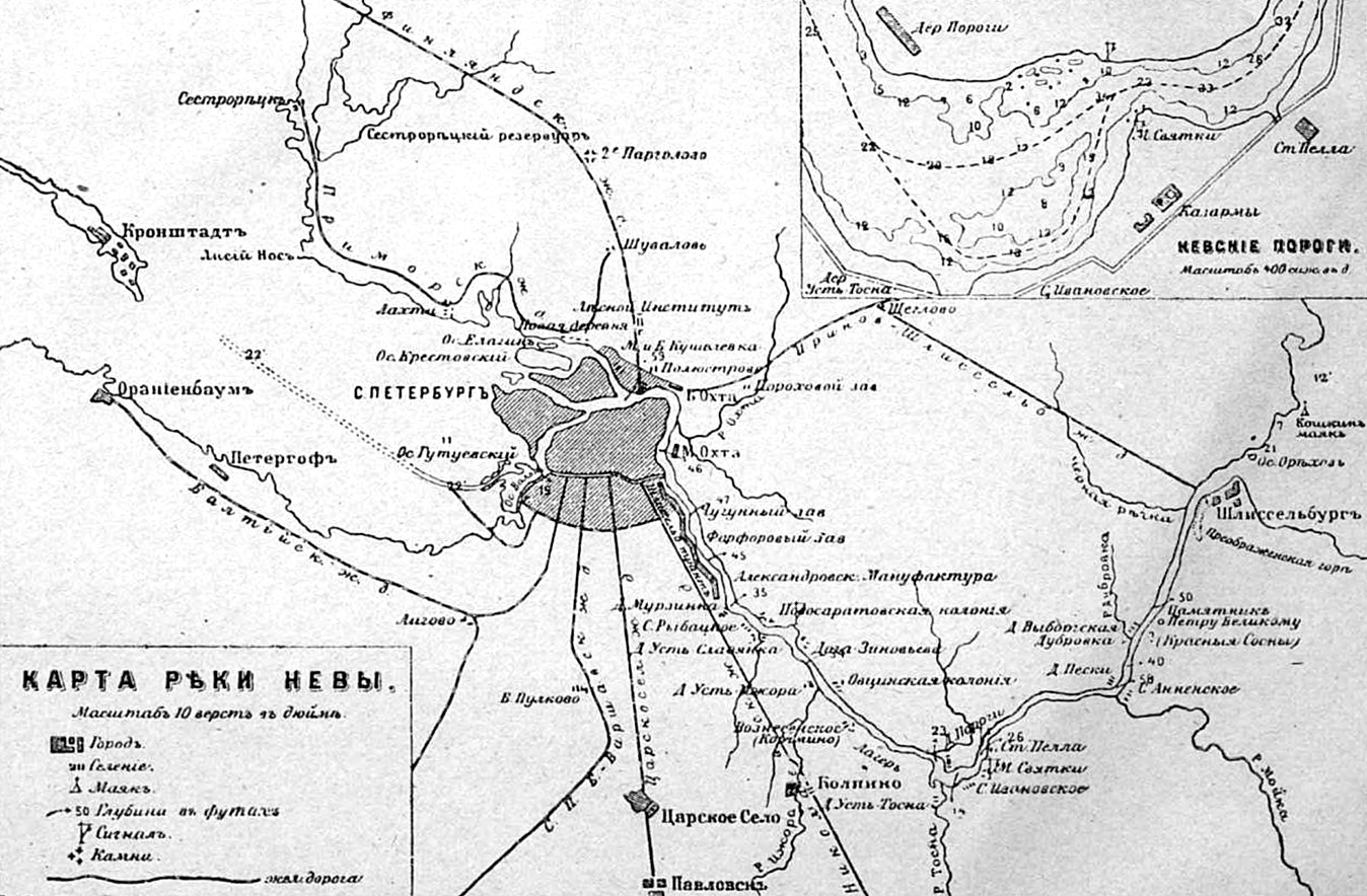 Под Смольным Нева делает крутую излучину, и пароходу приходится развить большую силу, чтобы преодолеть тот мощный напор поды, с которым красавица Нева спешит излиться в Финский залив, иначе называемый Маркизова лужа. Но сопротивление побеждено, пароход на средине широкой водной поверхности и быстро скользит вперед, против течения, быстро изменяется панорама берегов, один за другим появляются и исчезают разнообразные виды, величественные памятники, свидетели былого, давно прошедших дней, исчезнувших людей…